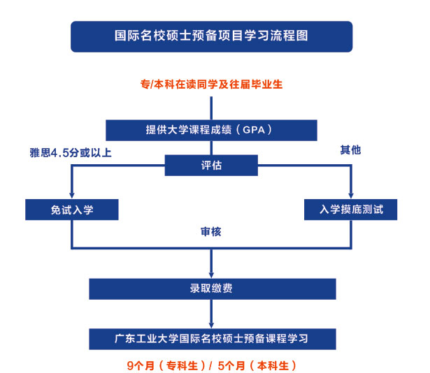广东工业大学国际高校硕士预备项目(简称:PMP)是广东工业大学联合北美、欧洲、澳洲、东南亚百余所出类拔萃大学举办的研究生层次国际教育合作项目。课程得到包括美国、英国、澳大利亚、新西兰及东南亚众多世界出类拔萃大学全面认可,为中国优秀本科生及专科生赴世界出类拔萃大学攻读硕士学位提供较佳途径。经项目录取的学生,在广东工业大学本校修读5-9个月硕士预备课程,PMP核心课程包括雅思英语、海外大学学术技能及硕士预备学分模块,帮助学生顺利达到海外大学硕士研究生入学标准。通过本项目考核的同学,可被本项目众多海外合作高校录取攻读硕士学位,通过1-2年学习,成绩合格后获得海外高校研究生学历及硕士学位。