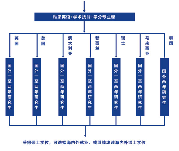 同步海外课堂:采用海外合作大学同步教学模式。小班制教学,专业课程由外籍行家授课,同等海外大学相关专业学术标准。授课方式以情景式、案例式及小组讨论式为主,帮助学生逐步适应掌握未来赴海外留学的教学环境和学习方法,保障学生在英语和专业课学习中熟练掌握课程知识点。