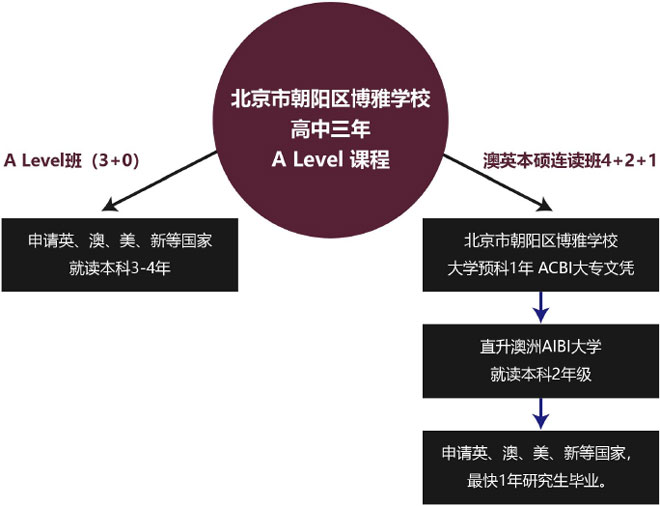 北京市朝阳区博雅学校引入国际三大课程体系之一的A-level课程,它是英国的普通(高中)教育高级水平课程,是英国的全民课程体系,通常被称为英国的金牌教育体系(British Global Education System)。学生根据教学计划安排再择参加A-level考试、根据成绩首选申请英国及英联邦国家的知名大学。