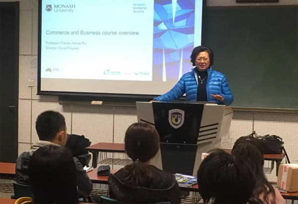 11月29日,莫纳什大学商学院博导博士生导师、中国项目主任朱久华教授专门到访,为我院学生进行了长达1个半小时的宣讲。朱教授从一开始就指出我院学生的“幸运”:莫纳什大学未来会关闭市场招生通道,很快以后,所有高中毕业想去莫纳什大学的中国学生将只能通过莫纳什大学合作伙伴的项目申请这所世界优秀的大学。我院作为莫纳什大学点对点的合作对象,可以保证项目内学生只要达到莫纳什大学的录取标准,便可进入莫纳什大学学习。而且拥有三重认证的蒙纳士商学院(包括世界排名TOP50专业,如会计金融和商务管理学)高度认可我院提供的专业课程(可转换高达48学分)。这样学分豁免的项目可以让同学们通过在北外2年的学习,既节省留学成本,又能快速提升自身的竞争力。
