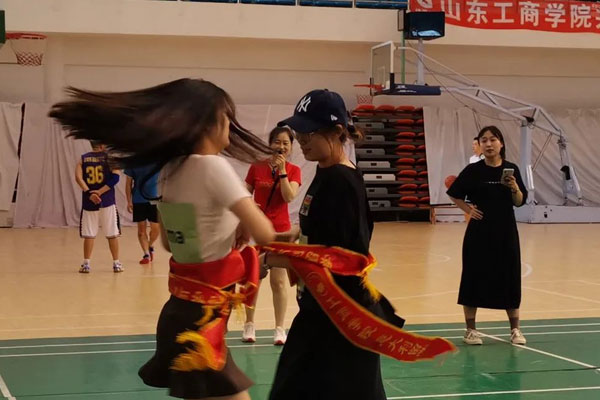 接下来进行的是游戏-齐心协力,两人“三只脚”组成一个整体,需要两个队员相互激励,全力配合才能达到目标。哪一支队先将球又稳又快地运回起点,获胜。